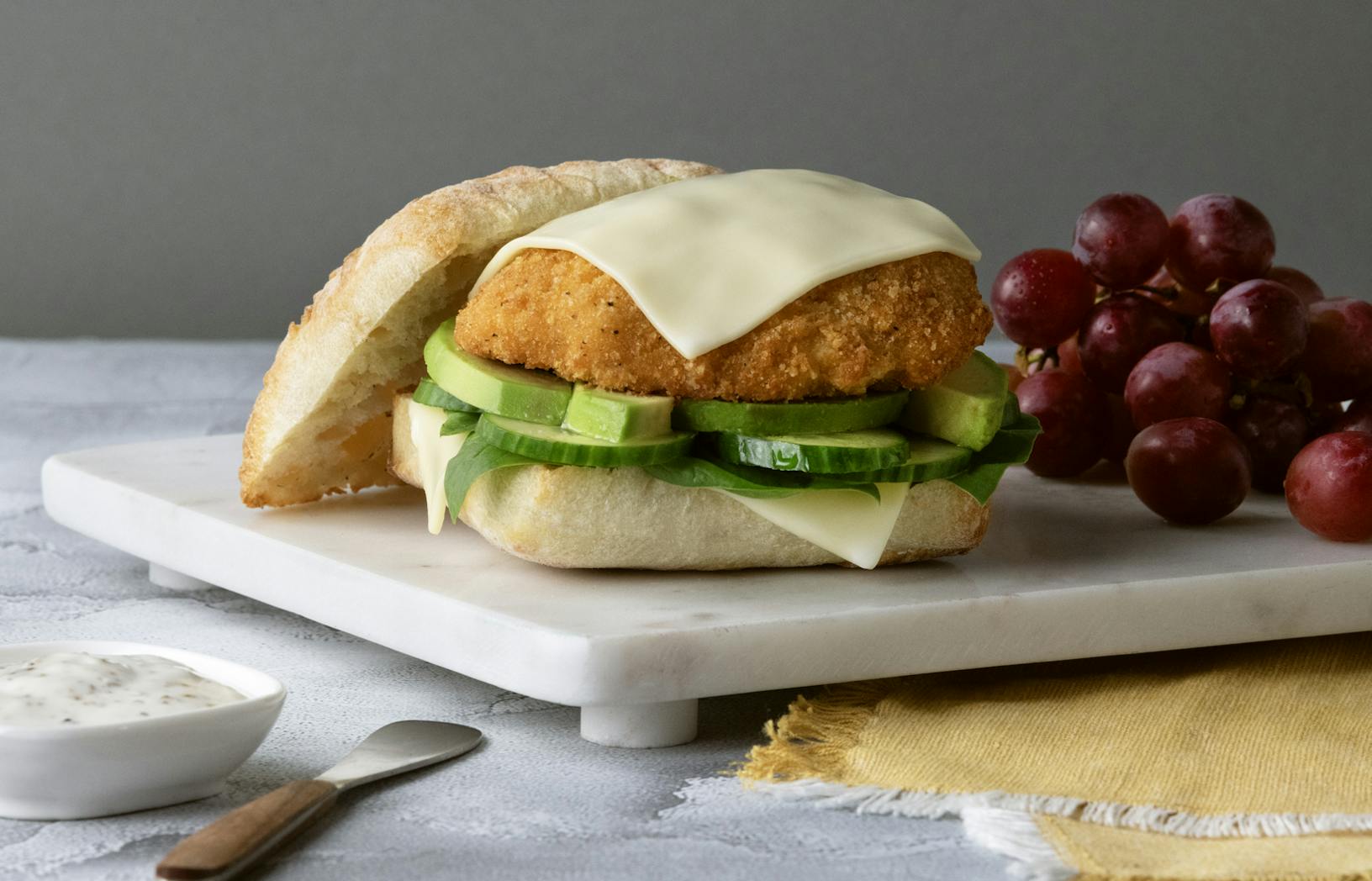 - Spread black pepper ranch dressing on the top and bottom of the roll.